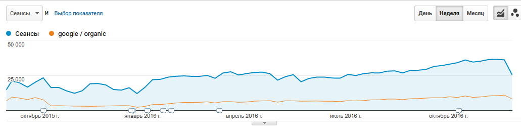 - З Гуглом більш цікава ситуація. Трафік на кінець 2015 року був хорошим, приблизно 7000 на тиждень, і підтримувався орендними посиланнями. Після того, як переїхали на ua домен і відмовилися від засланого просування, Гугл-трафік впав і повільно відновився протягом року. Сьогодні маємо 10000 трафіку з Гугла в тиждень (що вже більше вихідних значень) + бачимо тренд постійного зростання. Враховуємо той факт, що на зовнішні посилання витрачено 0 гривень.