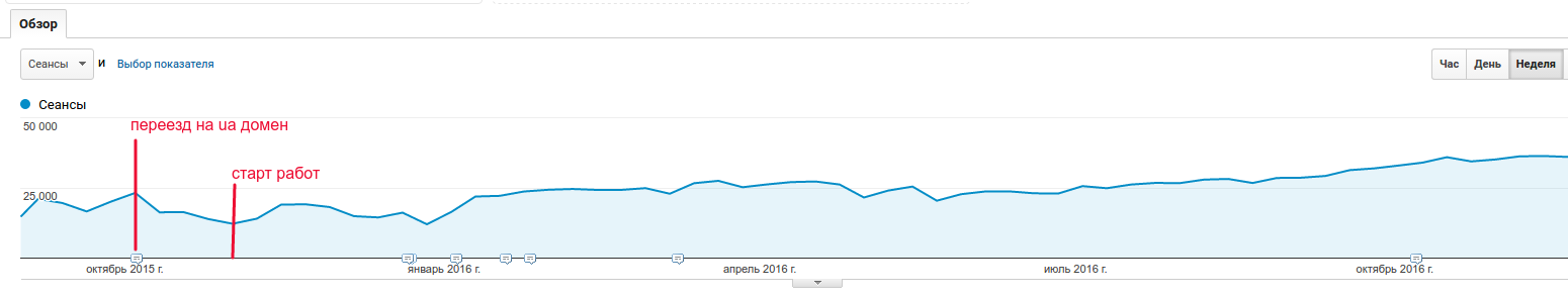 - коли ми взяли сайт, він тільки-тільки переїхав домен ua, тому відвідуваність просіла з 3000 до 1000-1300 в день, пошуковий трафік просів ще більше;